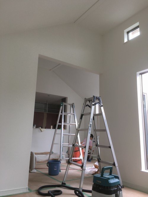 勾配 夫婦合作の勾配天井。天井が高いと貼るのは大変です。上の方は超暑いし…。